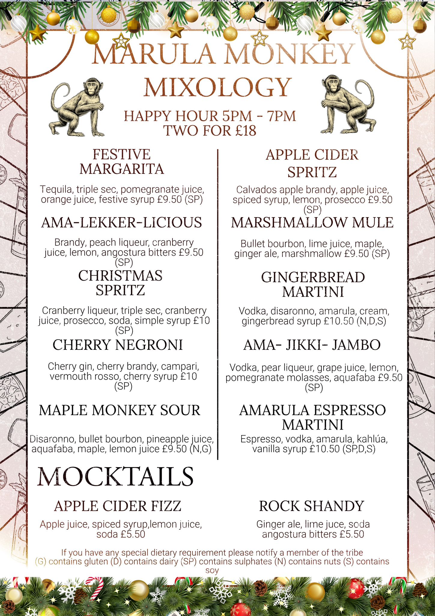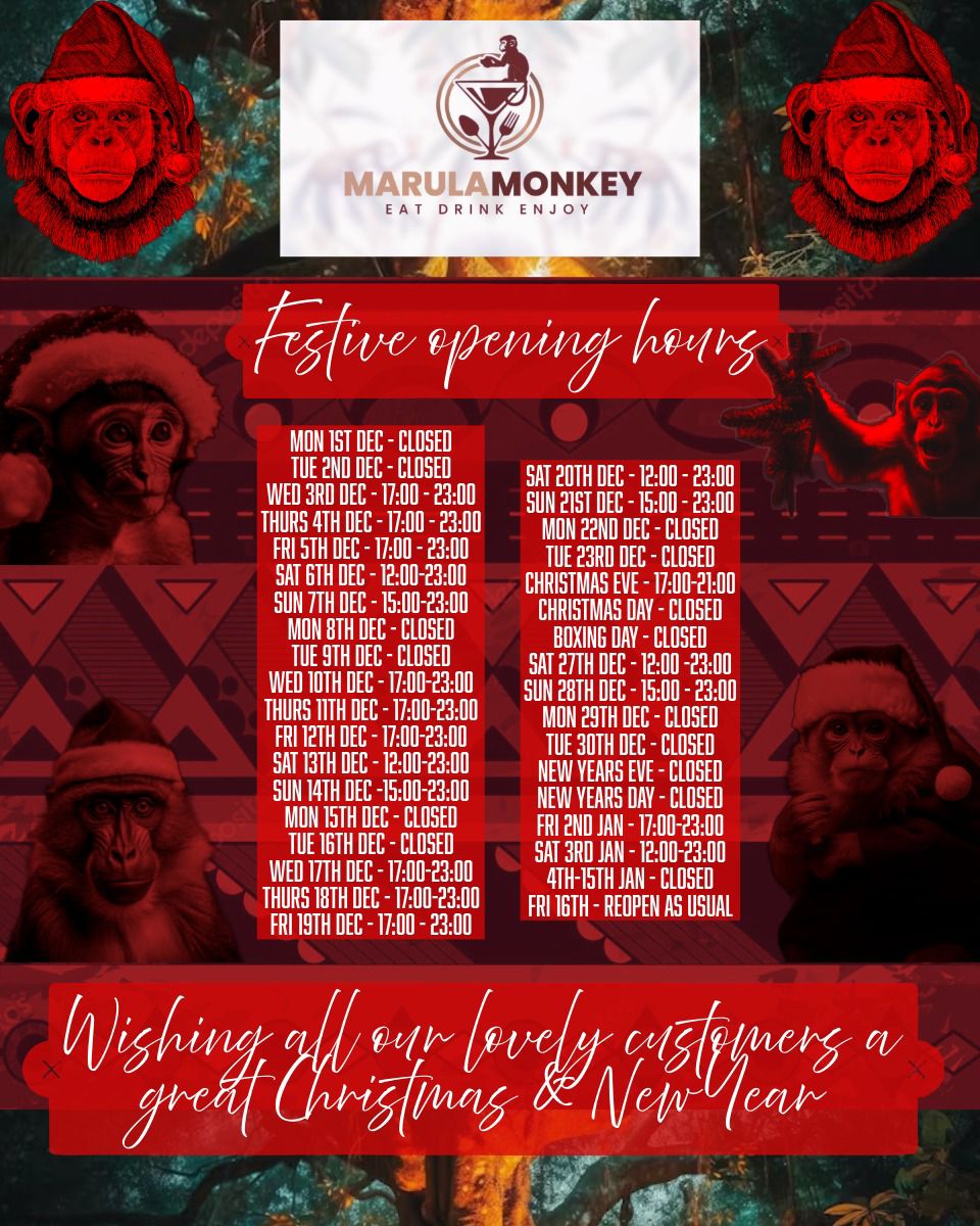 From intimate groups to full venue hire, we’ll help you create the perfect experience — complete with bold flavours, great drinks, and that signature Marula Monkey atmosphere. For groups of 8 or more, we kindly ask for a pre-order to help things run smoothly.